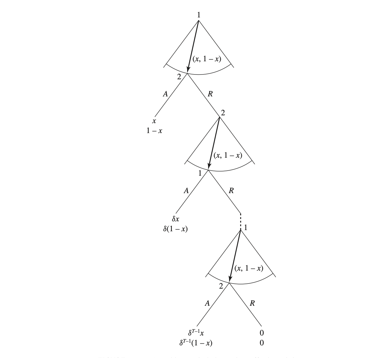 Vamos modificar o jogo do ultimato e admitir que se alguém não gosta da proposta da outra pessoa, pode fazer uma contraproposta, sempre de maneira alternada. Porém, o jogo acaba em até \(T\) rodadas se um acordo não for alcançado e ninguém fica com o bolo neste caso.